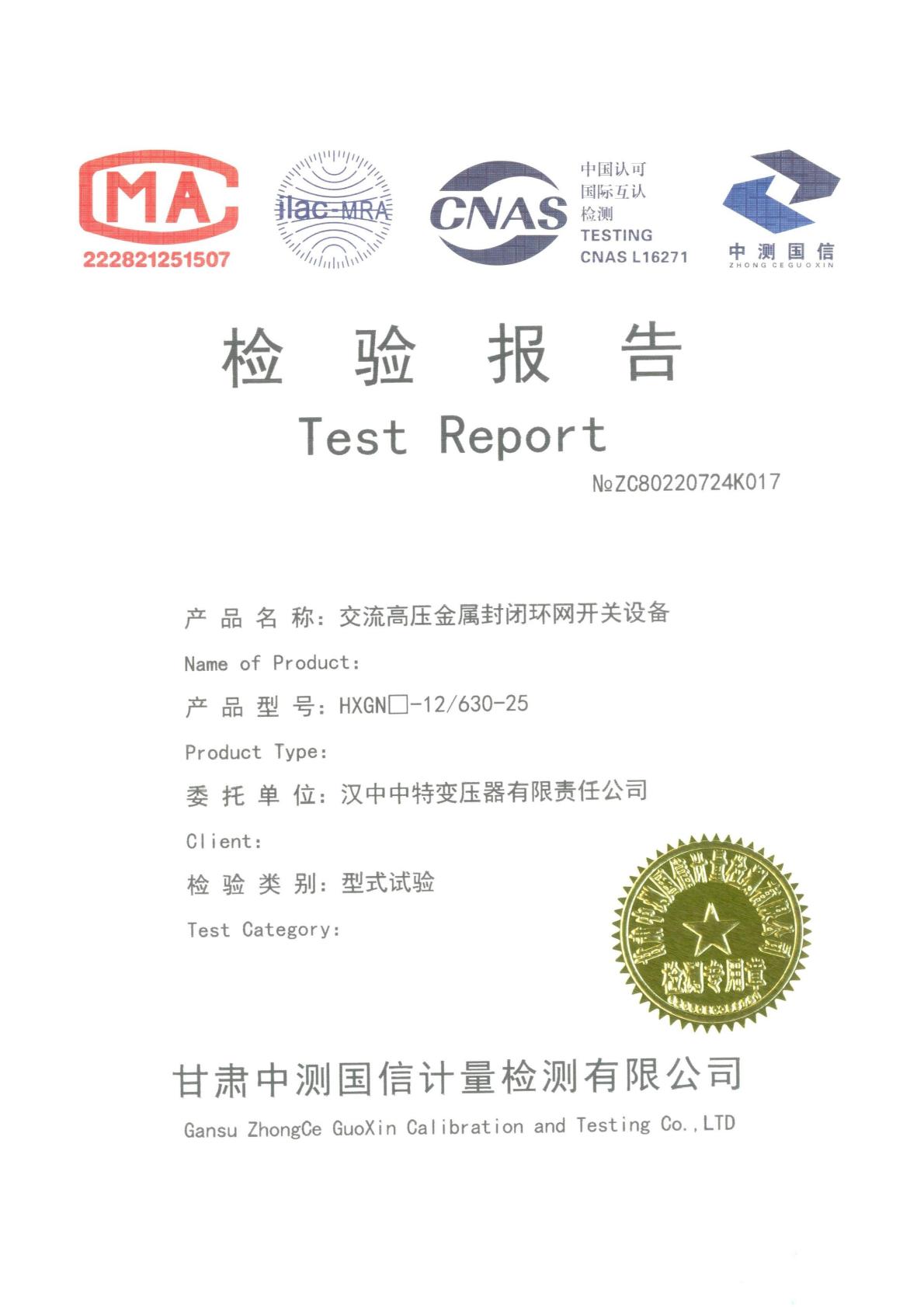 交流高压金属封闭环网开关设备 检验报告 (HXGN -12/630-25)